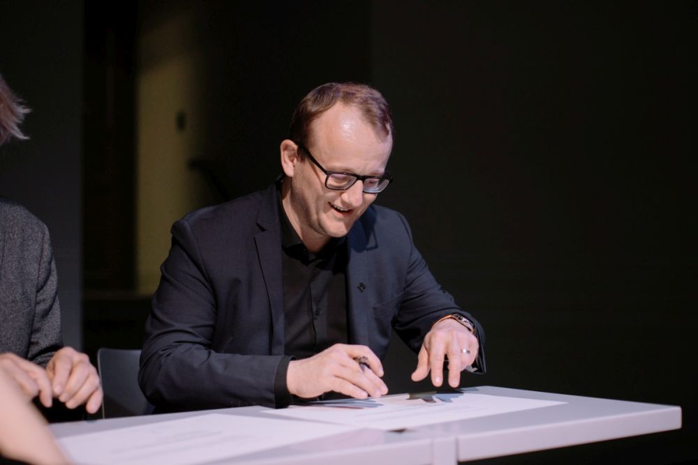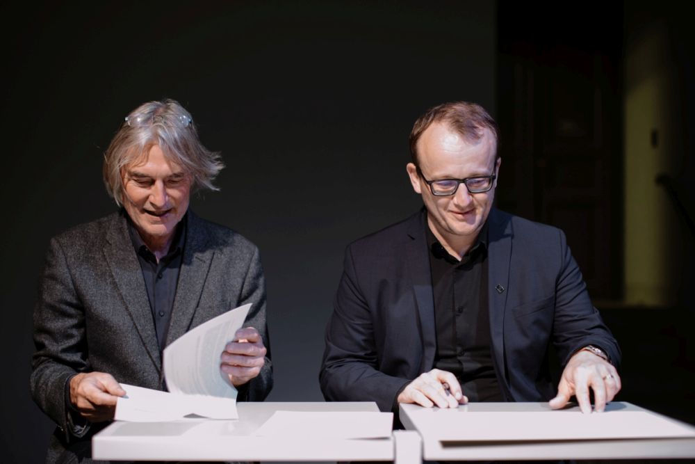 Národní knihovna ČR a Vysoká škola uměleckoprůmyslová v Praze (UMPRUM) uzavřely dne 17. října 2023 memorandum o spolupráci, jehož cílem je posílení dobrého jména obou institucí, zajištění kulturně-vzdělávacích akcí a vzájemná spolupráce. Memorandum podepsali generální ředitel Národní knihovny ČR Tomáš Foltýn a rektor UMPRUM Jindřich Vybíral. Foto: A. Typltová