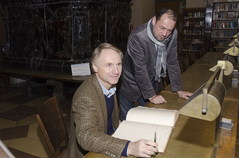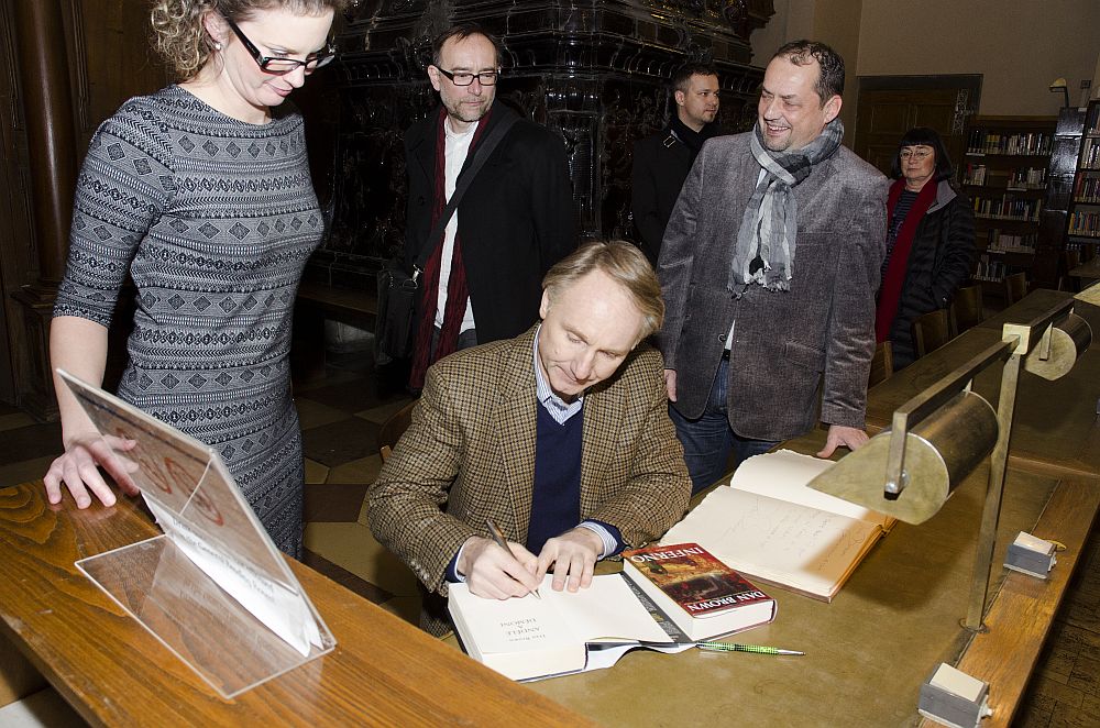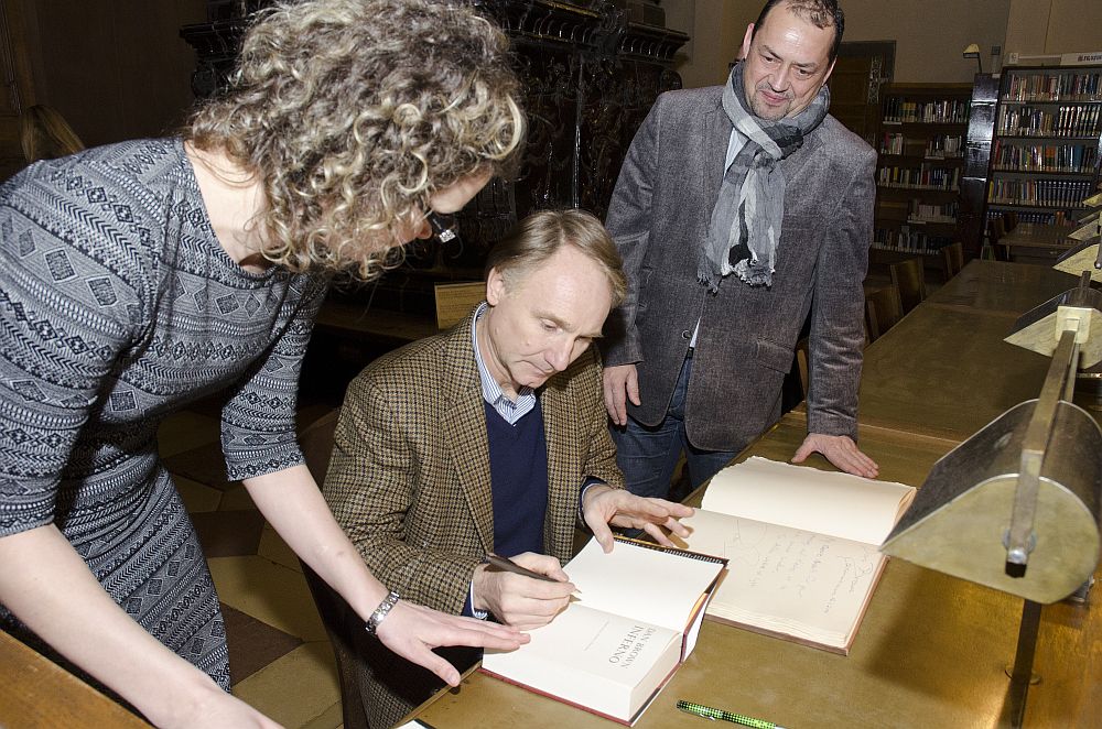 Autor bestsellerů jako Šifra mistra Leonarda, Andělé a démoni, Ztracený symbol a nejnověji také Inferno zavítal při svém evropském turné také do Prahy. Jedno z prvních míst kam Dan Brown po svém příletu zamířil, bylo i pražské Klementinum a v něm sídlící Národní knihovna ČR. Dan Brown zavítal do Prahy 12. ledna 2014 a ještě téhož dne se vydal zhlédnout Klementinum. Foto (1-6): Eva Hodíková - NK ČR. Foto (7-8): ARGO.