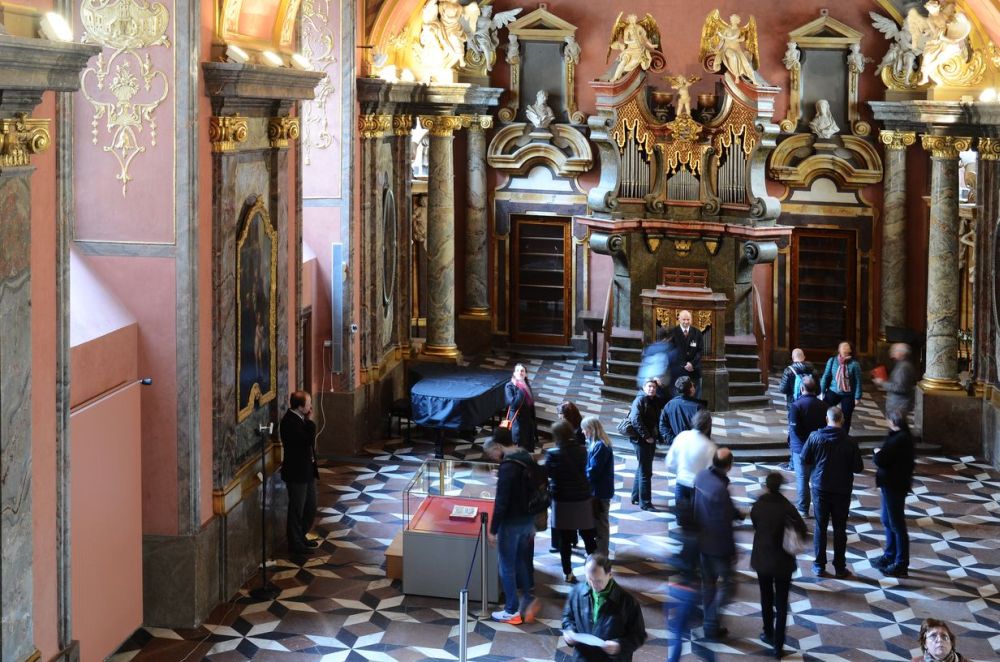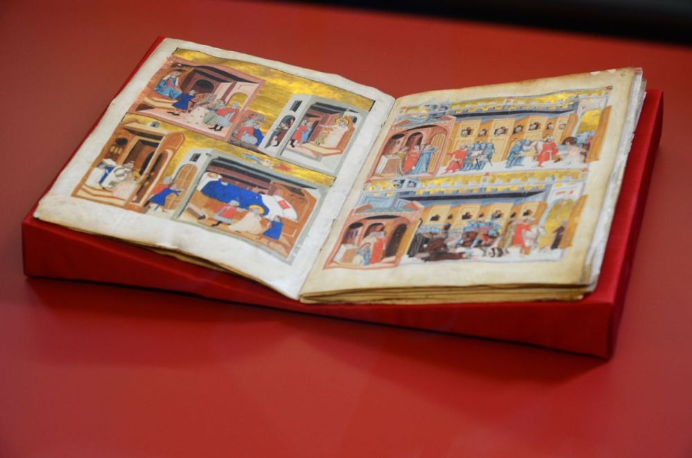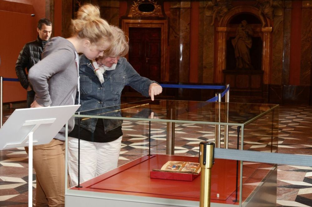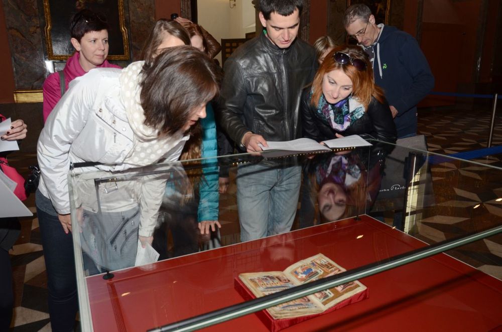Fotogalerie z mimořádného vystavení latinského zlomku bohatě iluminovaného rukopisu při příležitosti zahájení světové výstavy EXPO 2015 v Miláně. Jednodenní výstava se konala 1. května 2015 v Zrcadlové kapli Klementina. Foto: Eva Hodíková, NK ČR.