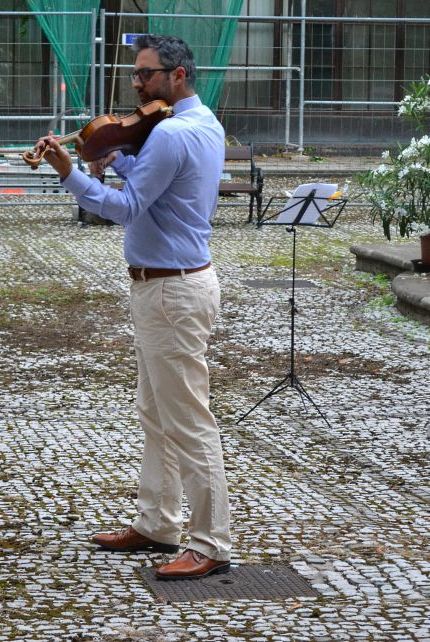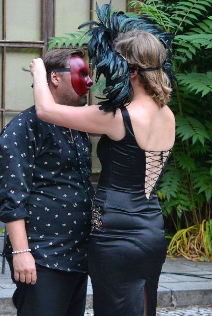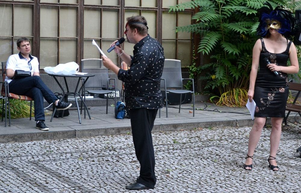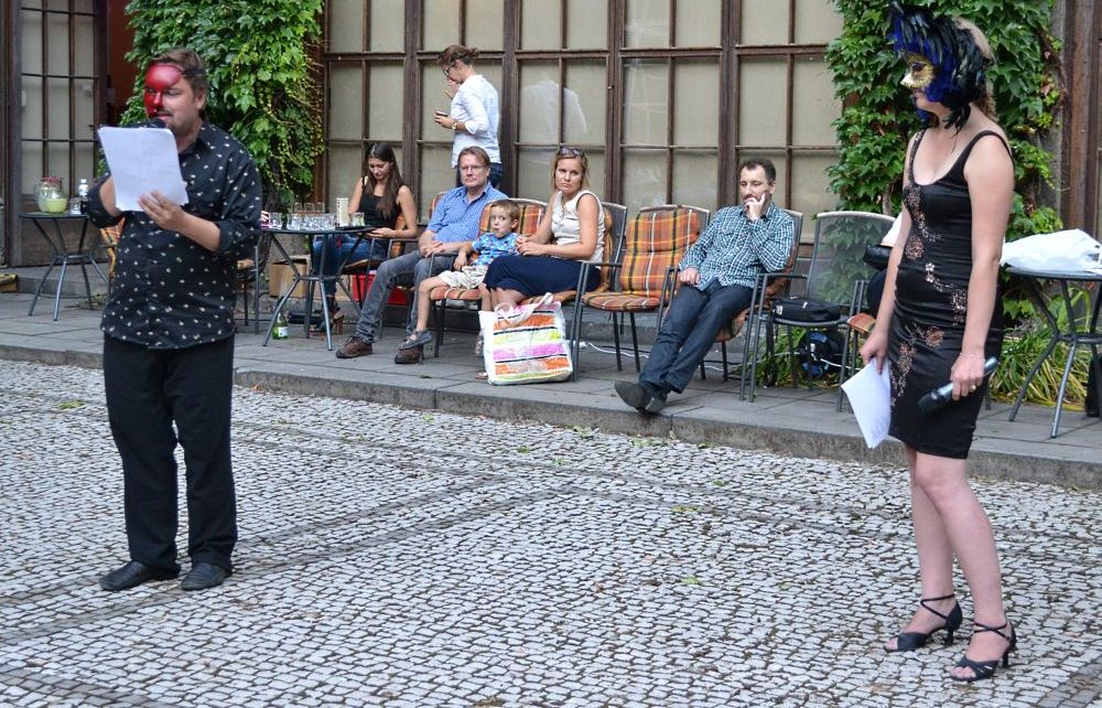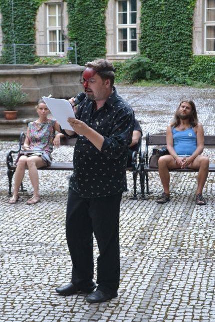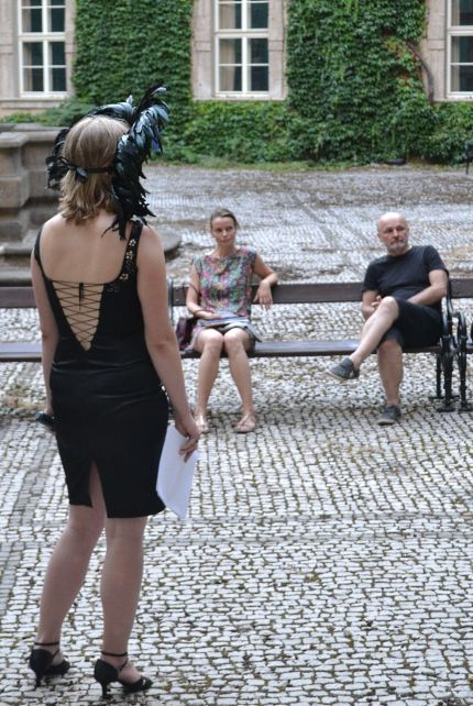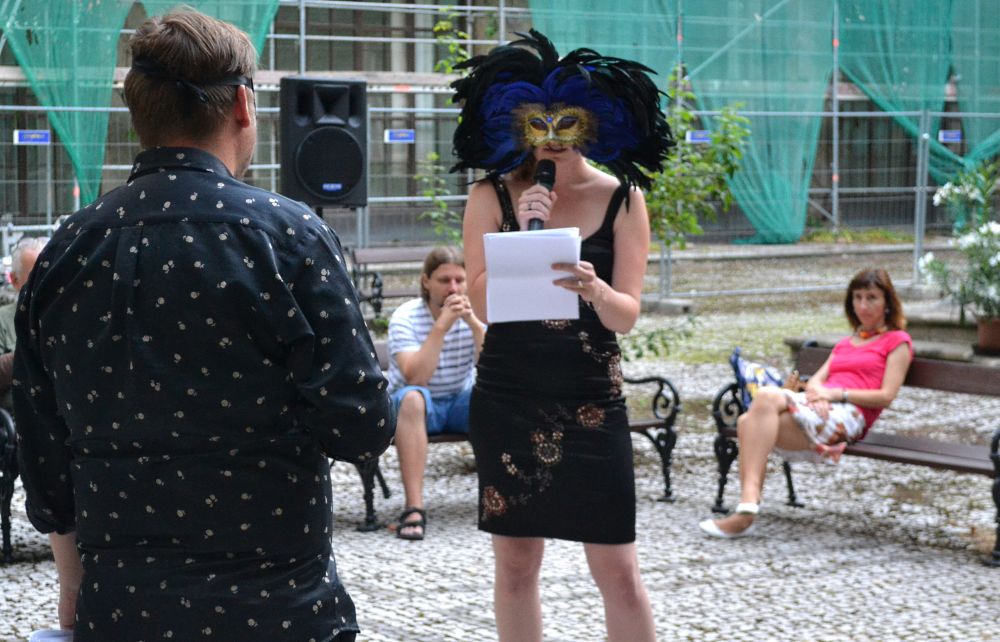Básnický večer "V uchu pne se strom, zvěř vychází ze záře" plný orfického zaříkávání, čarování a svádění s hudebním a tanečním doprovodem v podání básníka a publicisty Adama Borziče (*1978) a básnířky, teoložky a publicistky Magdalény Šipky (*1990), který se konal 25. srpna 2016 na Révovém nádvoří Klementina. Foto: T. Vaisová, NK ČR