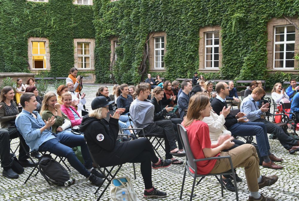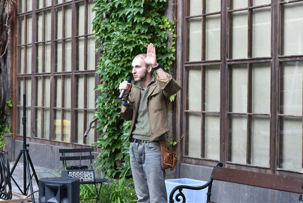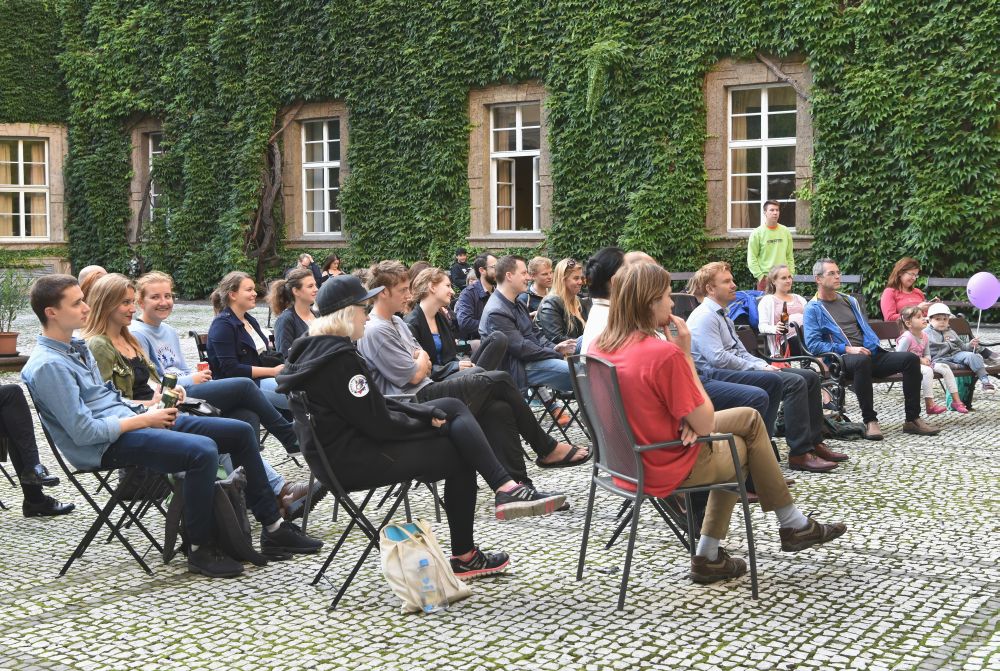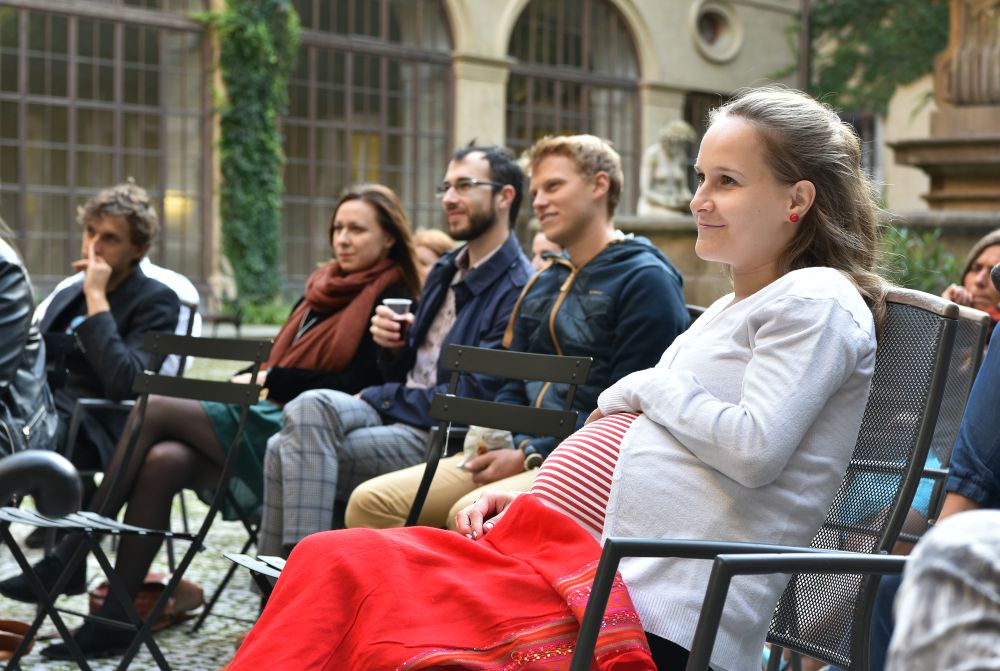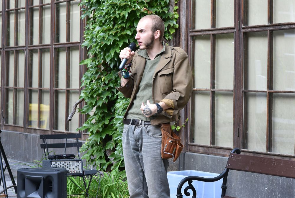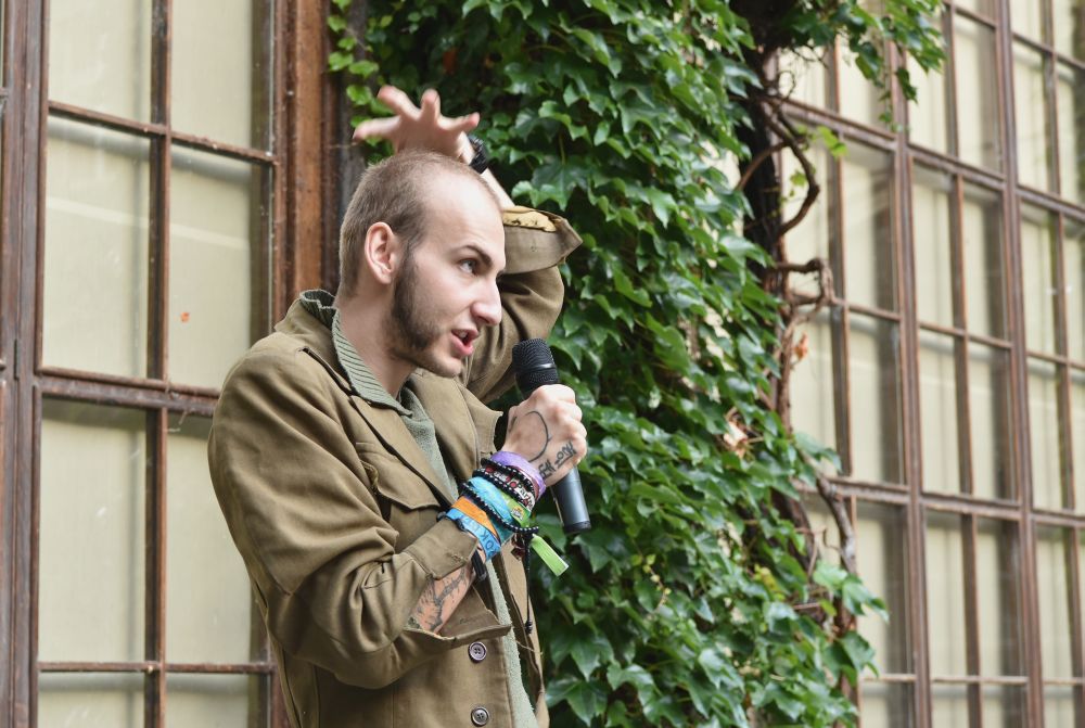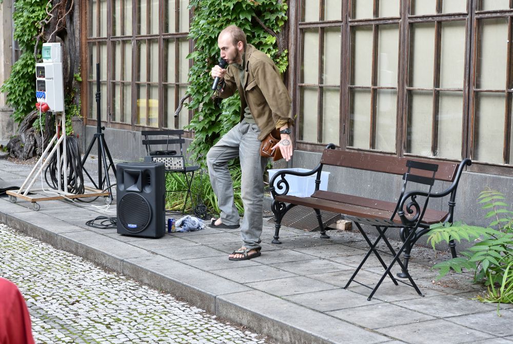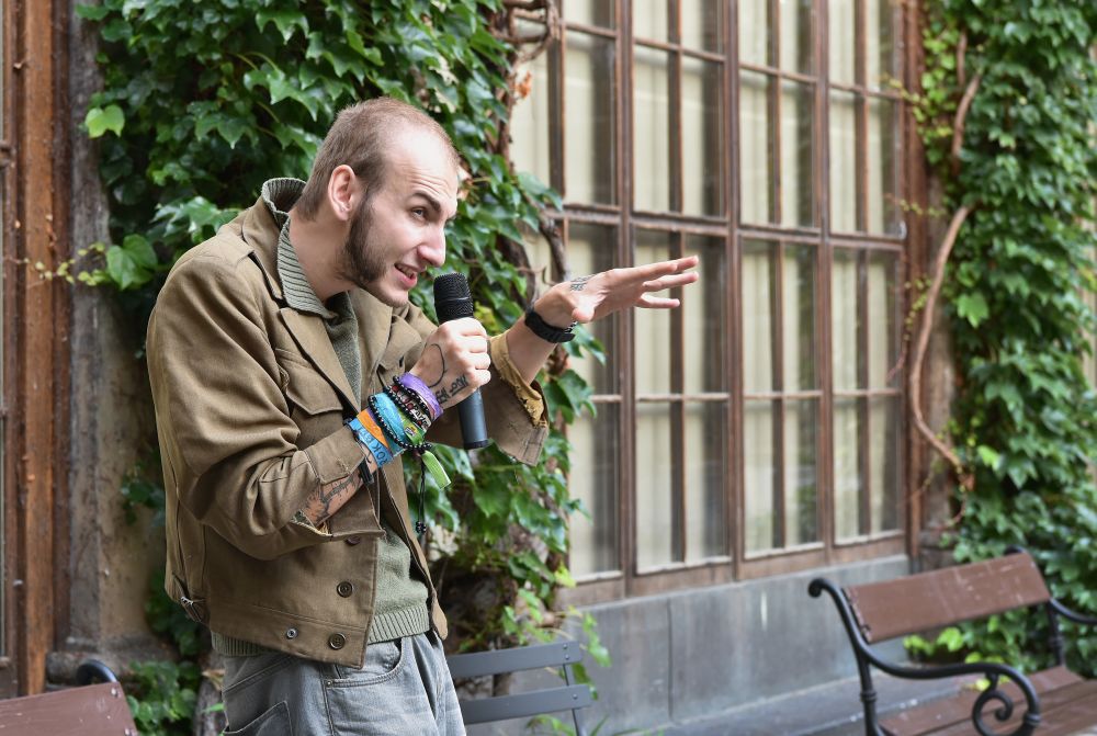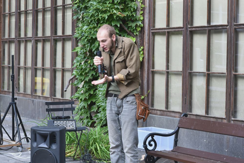 Hodinový zápas muže s mikrofonem. Křížení slam poetry, stand-upu, monodramatu a školení o bezpečnosti práce - to vše zahrnovalo představení, které se v rámci cyklu Klementinum 190 konalo 6. září 2017 na Révovém nádvoří. Foto: M. Kárná, NK ČR.