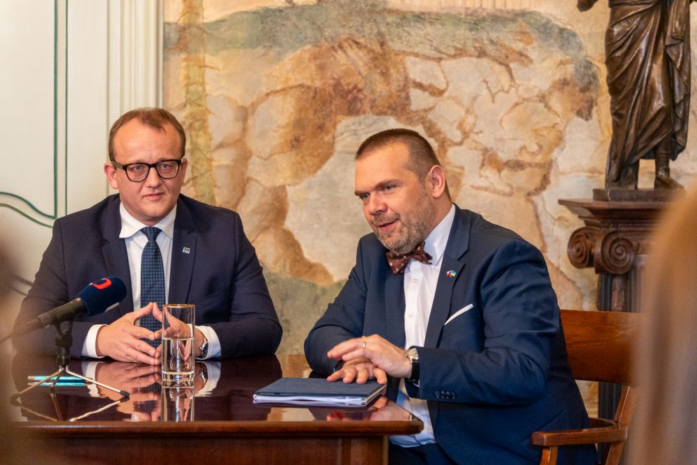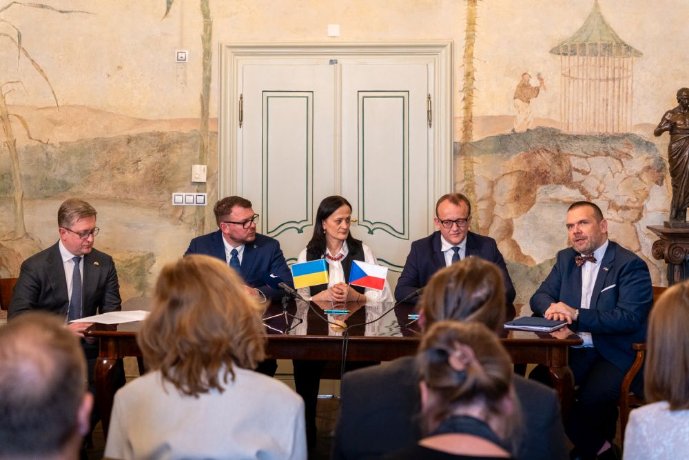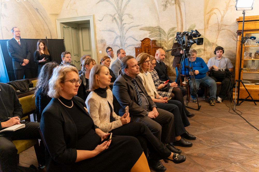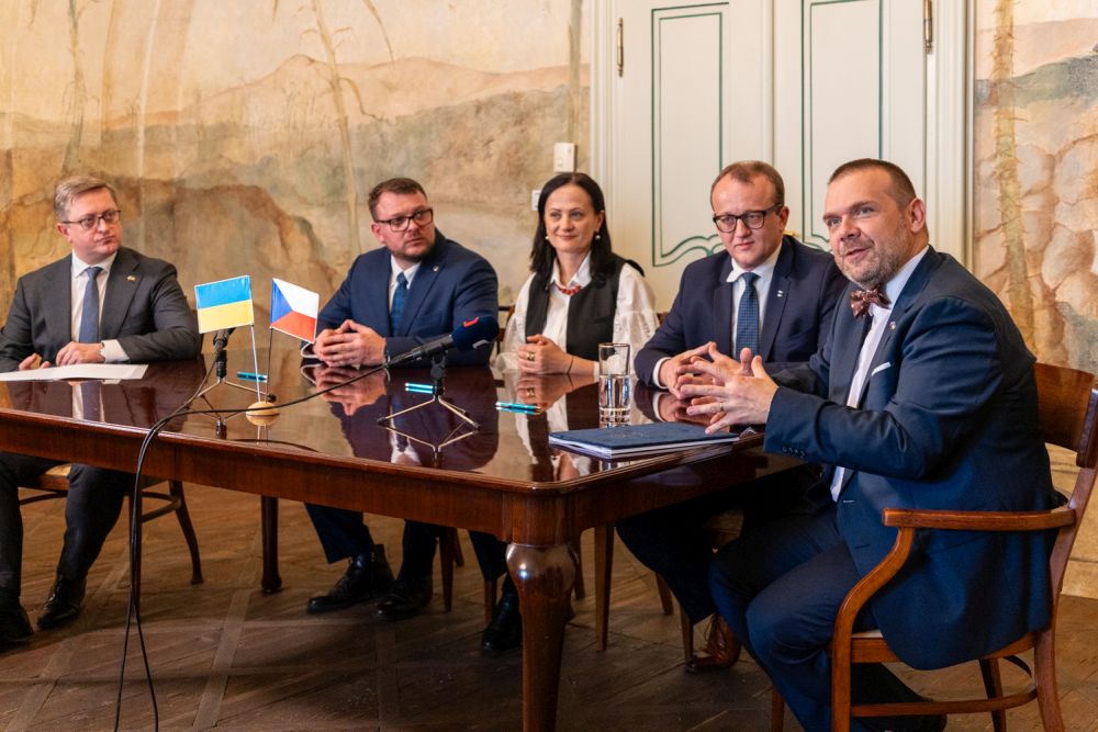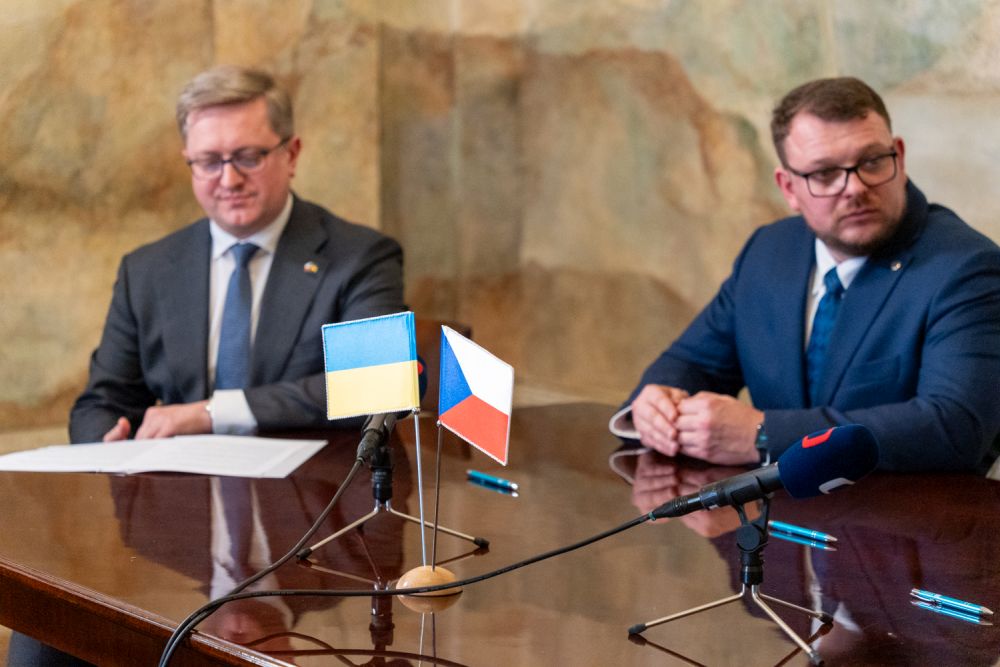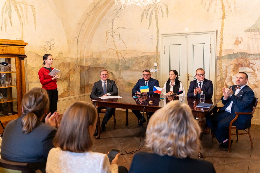 V Národní knihovně ČR bylo ve středu 23. 10. 2024 podepsáno memorandum o vzájemné spolupráci mezi Národní knihovnou České republiky, Národní knihovnou Yaroslava Mudrého v Kyjevě a Ukrajinskou knihovnickou asociací a zároveň darovací smlouva mezi oběma uvedenými knihovnami. Ta řeší předání mobilního pracoviště ochrany knižní kultury, určeného k záchraně kulturního dědictví Ukrajiny. Foto: Z. Homolka Fedorová, NK ČR.