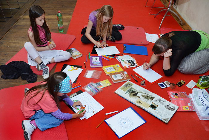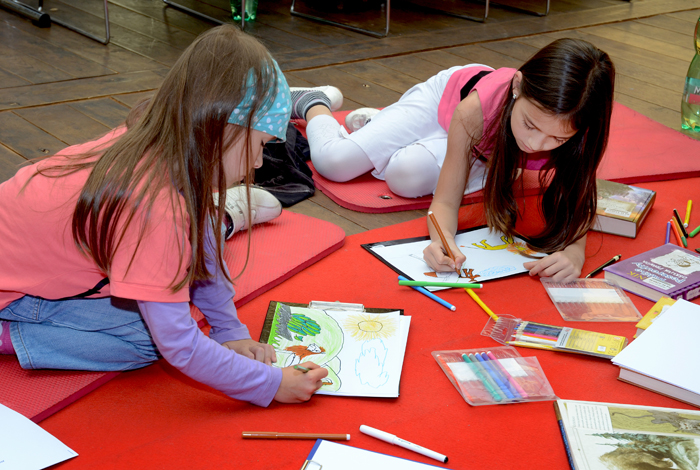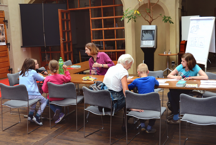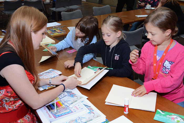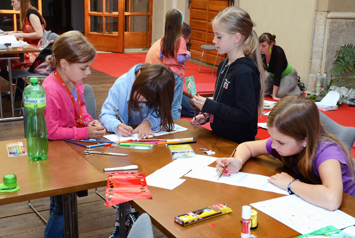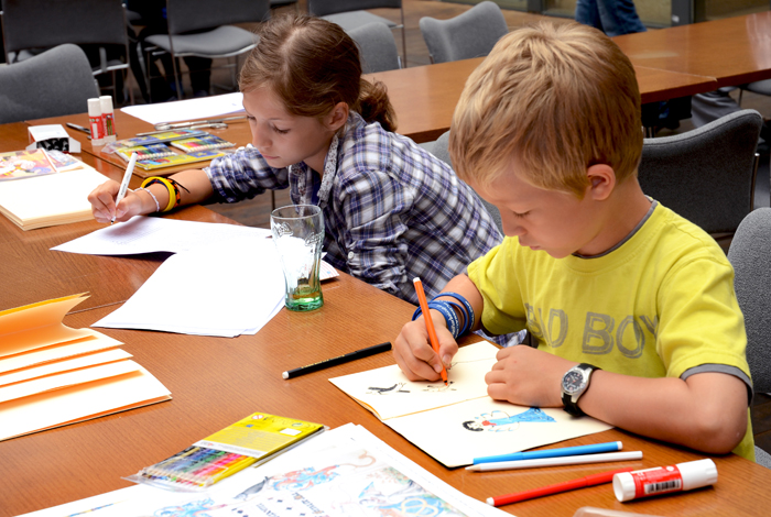 Akce "Vítání prázdnin" se konala 27. 6. 2013 v Nosticově paláci. Tvořivé dílny dětem nabídly možnost nakreslit si vlastní komiks, malovat podle četby, malovat knižní obaly nebo ručně výrobit vlastní knihu. Součástí programu byla přednáška „Známá neznámá pravidla Facebooku". Foto: Milena Kárná, NK ČR.